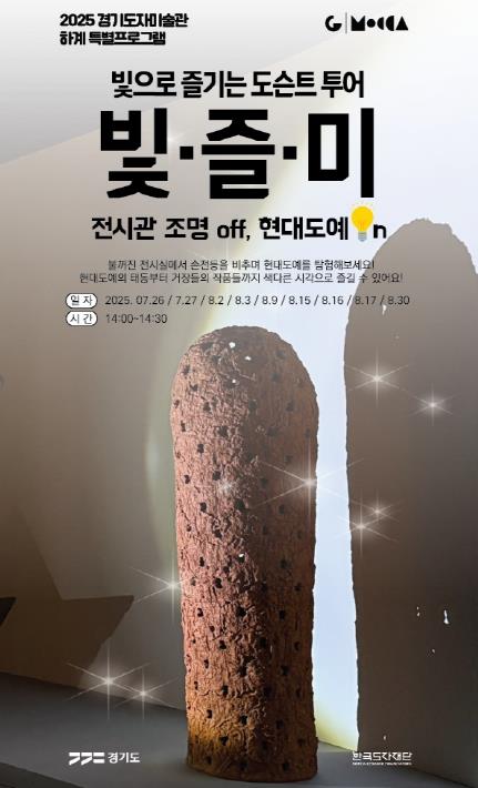 [뉴스스텝] 한국도자재단 경기도자미술관이 7월 26일부터 8월 30일까지 주말과 공휴일 등 9회에 걸쳐 경기도자미술관 2층 상설전시실에서 여름 특별 도슨트(전시 해설가) 프로그램 ‘빛으로 즐기는 미술관’을 운영한다.