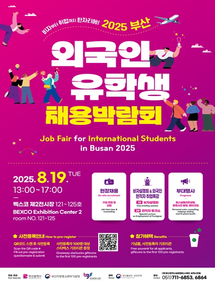 [뉴스스텝] 부산시는 내일(19일) 오후 1시부터 5시까지 벡스코 제2전시장(1층 121~125호)에서 '2025 외국인 유학생 채용박람회'를 개최한다고 밝혔다.