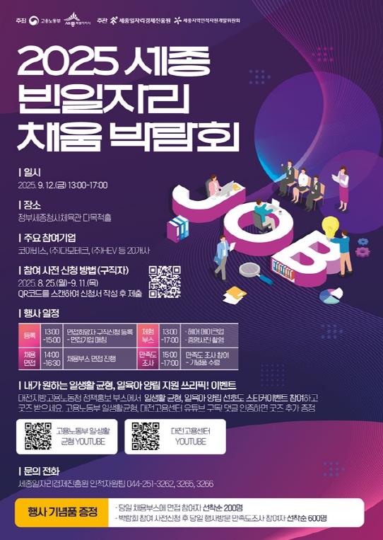 [뉴스스텝] 세종일자리경제진흥원은 오는 9월 12일 ‘2025년 세종 빈일자리 채움 박람회’를 개최한다. 이번 박람회는 세종시 뿌리산업과 전문과학기술업 기업의 인력난 해소와 지역 구직자의 취업 기회 확대를 위해 마련됐다.