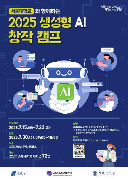 [뉴스스텝] 꿈이 모이는 도시, 미래를 그리는 강남구가 오는 7월 30일 서울대학교 관악캠퍼스에서 중학교 1∼3학년 학생 72명을 대상으로 ‘생성형 AI 창작 캠프’를 연다.