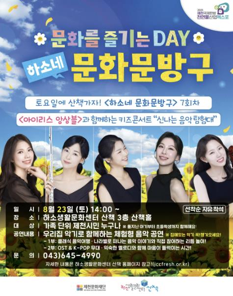 [뉴스스텝] 제천문화재단은 오는 23일 오후 2시, 하소생활문화센터 산책에서 '하소네 문화문방구' 7회차 프로그램으로 클래식 연주단체 아이리스 앙상블과 함께하는 키즈 콘서트 '신나는 음악 탐험대'를 개최한다고 밝혔다.