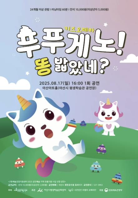 [뉴스스텝] 아산시가 ‘2025 공연예술 유통 지원사업’에 선정된 작품 키즈오페라 ‘푸푸게노! 똥 밟았네?’를 8월 방학 시즌을 맞아 17일 아산아트홀에서 개최한다.