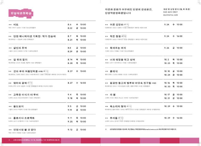 이번 주 상영작으로는 ▲8월 6일 오전 10시 ‘비트’ ▲8월 7일 오전 10시 ‘단편 애니메이션 기획전: 작가 전승배’ ▲8월 8일 오전 10시 ‘살인의 추억’이 예정돼 있어, 시대별 감성과 장르를 아우르는 다양한 관람 기회를 제공할 것으로 기대된다.