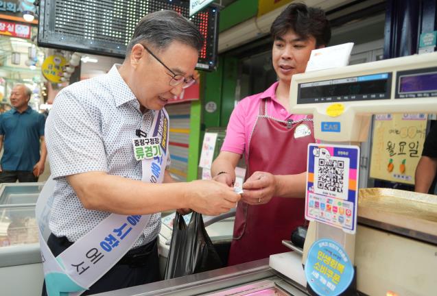 류경기 구청장은 동원시장에서 식재료 등을 구입하며 민생회복 소비쿠폰으로 결제하고, 시장 곳곳을 돌며 상인들과 인사를 나누고 현장 의견을 청취했다. 소비쿠폰 사용에 대한 긍정적인 반응과 함께, 이용에 따른 건의 사항도 경청하며 실효성 있는 정책 추진을 약속했다.