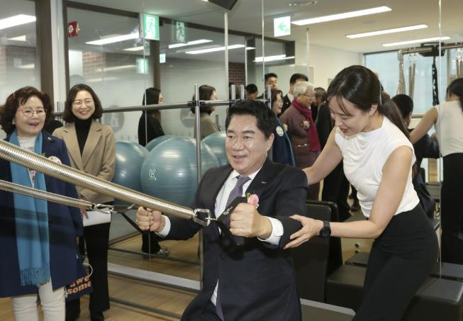 | ▲ 지난달 개최된 관악더행복마루 개관식에서 기구 필라테스 체험하는 박준희 관악구청장 |