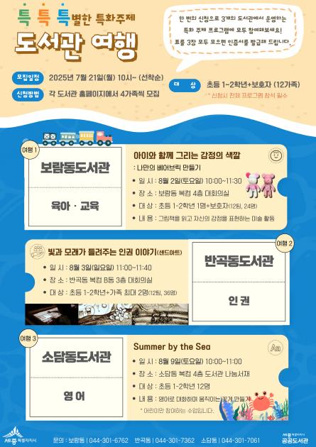 [뉴스스텝] 세종특별자치시 반곡동·보람동·소담동도서관이 오는 8월 2일부터 9일까지 여름방학을 맞은 초등학생과 가족을 대상으로 ‘특 특 특별한 도서관 여행’프로그램을 운영한다.