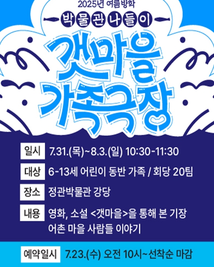 [뉴스스텝] 부산시립박물관 소속 정관박물관은 여름방학을 맞아 고전 문예영화 '갯마을'을 주제로 한 6∼13세 어린이 동반 가족 교육프로그램 '우리 가족 박물관 나들이 – 갯마을 가족극장'을 7월 31일부터 8월 3일 매일 오전 10시 30분부터 60분간 운영한다고 밝혔다.