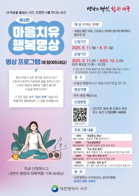[뉴스스텝] 대전 서구는 바쁜 일상과 스트레스로 지친 구민들의 마음 건강 회복을 위해 오는 11일부터 ‘마음치유 행복명상’ 프로그램 참여자를 모집한다.