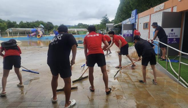 ▲ 신정호정원 물놀이장 내부로 유입된 토사 제거 작업 |