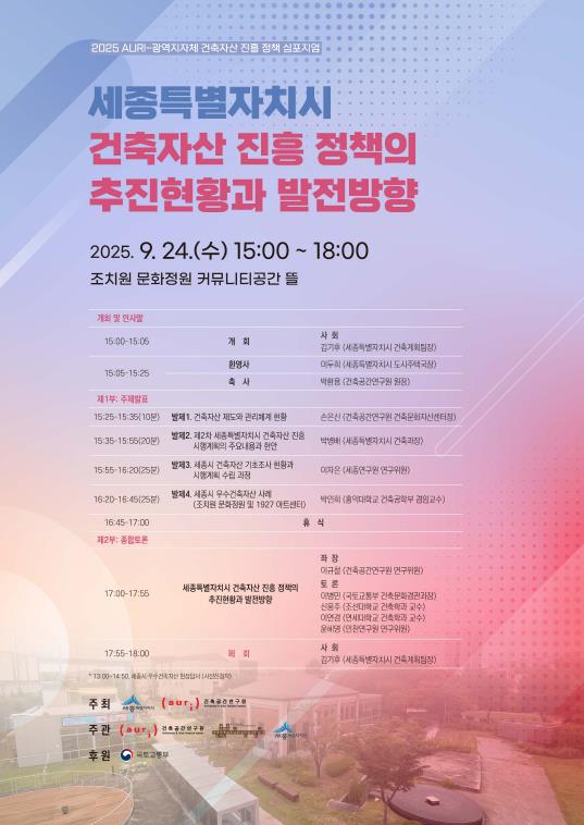 정책 심포지엄에서는 손은신 건축공간연구원 건축문화자산센터장이 ‘건축자산 제도와 관리체계 현황’을, 박병배 세종시 건축과장이 ‘세종시 건축자산 진흥 시행계획’을 주제로 발표한다.