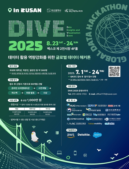 정나영 시 미래기술전략국장은 “이번 '다이브(DIVE) 2025'를 통해 국내외 청년 인재들이 부산에 모여 데이터 기반 혁신 생태계를 확산하고, 이를 바탕으로 부산이 글로벌 데이터 허브 도시로 자리매김할 수 있도록 적극적으로 지원하겠다”라고 전했다.