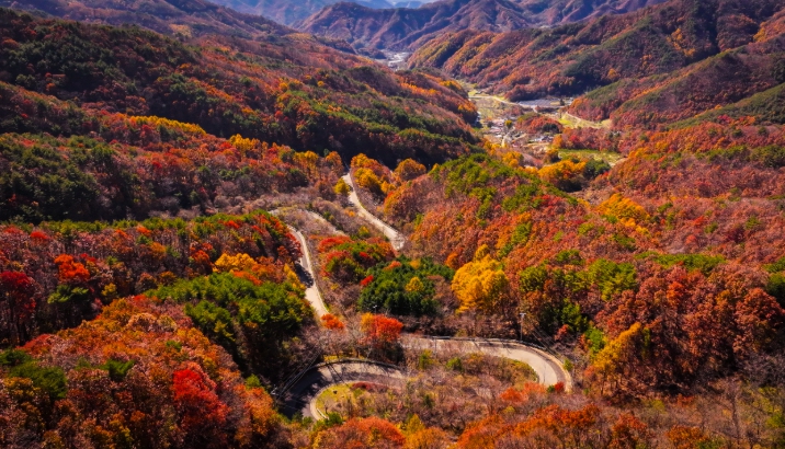 굽이마다 휘돌며 이어지는 길 위로 붉게 물든 숲이 드리워져, 한 폭의 수묵화처럼 운치를 자아낸다.