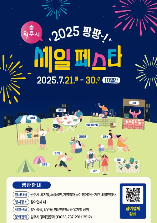 [뉴스스텝] 원주시는 경기 불황으로 위축된 소비심리를 회복하고, 침체한 지역 상권에 활력을 불어넣고자, 7월 21일(월)부터 30일(수)까지 10일간 ‘원주시 팡팡 세일 페스타’를 개최한다.