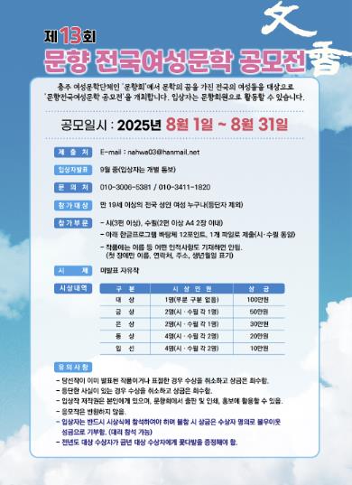 시상식은 오는 10월 17일 오후 3시, 충주시 호암생태공원 야외무대에서 진행될 예정이며, 문향회원과 공모전 입상자들의 작품을 포함한 시화전도 함께 개최된다.