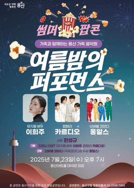 [뉴스스텝] 서울 용산구가 오는 23일 오후 7시 용산아트홀(녹사평대로 150) 대극장 미르에서 여름맞이 기획공연 ‘썸머팝콘: 여름밤의 퍼포먼스’를 개최한다.