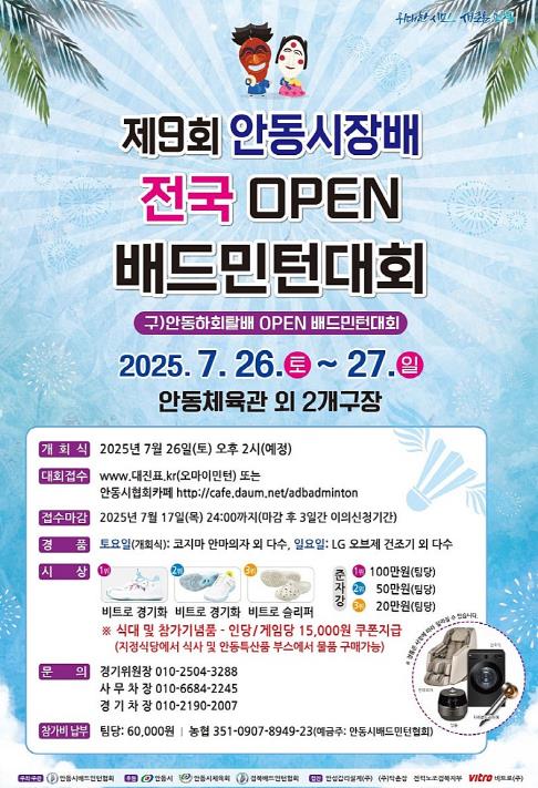 [뉴스스텝] ‘제9회 안동시장배 OPEN 배드민턴대회’가 오는 7월 26일부터 27일까지 이틀간 안동체육관과 안동다목적체육관에서 열린다.