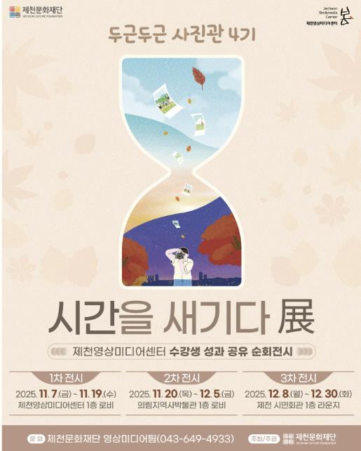 [뉴스스텝] 제천문화재단이 제천영상미디어센터 교육 수강생들의 작품을 순회 전시하는 '두근두근 사진관 4기 : 시간을 새기다 展'을 오는 11월 7일부터 12월 30일까지 제천시 일원에서 개최한다.
