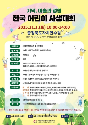 사생대회는 자치연수원 풍경 및 자유 주제로 진행되며, 미취학아동과 초등학생(유치부·초등부) 누구나 참가할 수 있다. 참가비는 무료이며, 사전접수(충청북도미술협회 홈페이지) 또는 대회 당일 오전 9시 30분부터 10시까지 현장 접수를 통해 참여할 수 있다.