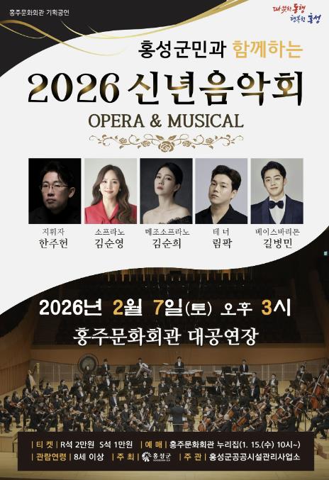 [뉴스스텝] 홍성군 홍주문화회관은 내달 7일 오후 3시에 ‘홍성군민과 함께하는 2026 신년음악회’를 개최한다고 밝혔다. 이번 음악회는 병오년 새해를 맞아 오페라와 뮤지컬 넘버를 아우르는 다채로운 프로그램으로 관객들과 만날 예정이다.