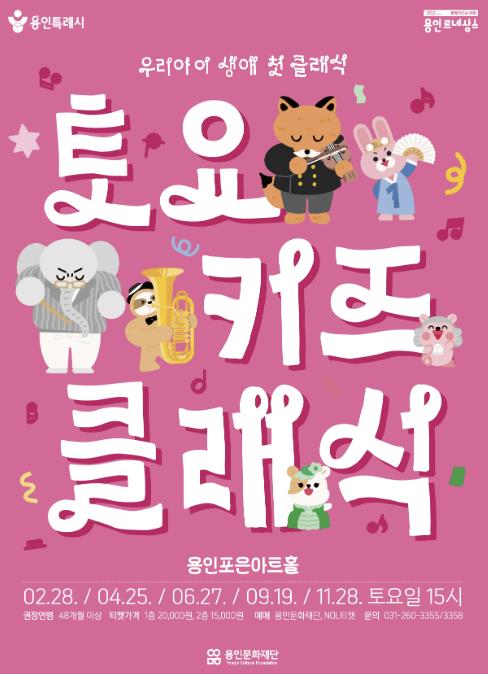 공연은 연간 총 5회 진행되며, 첫 공연은 2월 28일 오후 3시에 열린다. 관람 권장 연령은 48개월 이상으로, 티켓 예매는 상·하반기로 나누어 진행된다. 상반기 3회차 공연은 ▲2월28일, ▲4월25일, ▲6월27일 이며, 이를 한번에 예매할 경우 30% 할인된 패키지 상품을 이용할 수 있다. '2026 토요키즈클래식' 상반기 티켓은 1월 15일 오후 2시부터 용인문화재단 홈페이지 및 NOL티켓을 통해 예매가 가능하며, 공연 관련 문의는 용인문화재단 CS센터로 하면 된다.