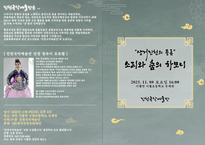 [뉴스스텝] (재)생거진천문화재단은 오는 11월 8일 오후 4시 이월초등학교 ‘무제관’에서 진천국악예술단이 ‘진천의 풍류, 소리와 춤의 하모니’ 공연을 개최한다고 20일 밝혔다.