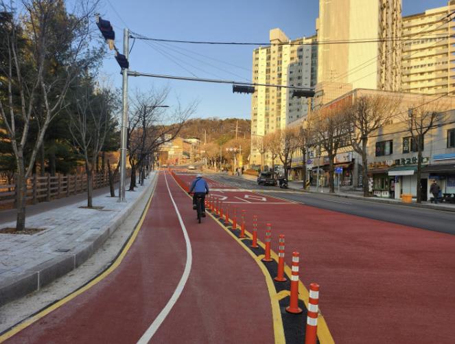 또 광교산로 보행·자전거 이용 여건을 개선하기 위해 320m 길이의 자전거도로를 새로 조성했다. 보행자와 차량이 한 공간을 쓰던 구간에 자전거 전용 공간을 분리해 보행자와 자전거 이용자의 안전을 강화했다.