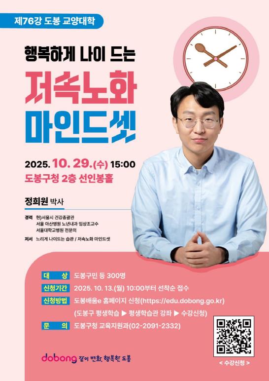 [뉴스스텝] 서울 도봉구가 10월 13일 오전 10시부터 ‘저속노화 마인드셋’ 특강 참여자를 모집한다.