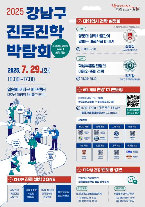 조성명 강남구청장은 “이번 박람회가 사교육 의존이 아닌, 공교육을 중심으로 한 맞춤형 진로‧진학 지원의 모범 사례가 되도록 준비했다”며, “앞으로도 학생 개개인의 잠재력을 끌어낼 수 있는 교육 지원에 최선을 다하겠다”고 밝혔다.