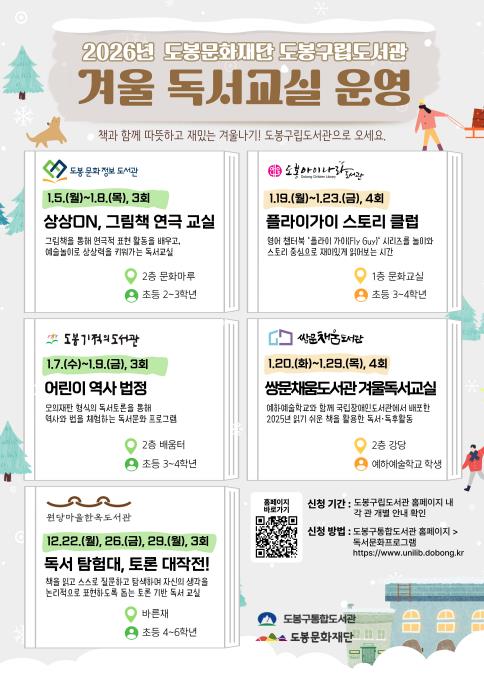 [뉴스스텝] 서울 도봉구 도봉문화재단 소속 구립도서관 5개관이 ‘2026년 겨울 독서교실’을 운영한다.