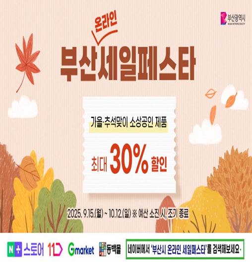 [뉴스스텝] 부산시는 15일부터 10월 12일까지 약 한 달간 민족 대명절 추석을 맞아 '가을 추석맞이 부산세일페스타(온라인) 특별 할인전'을 진행한다고 밝혔다.