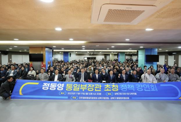 [뉴스스텝] 민주평화통일자문회의 성북구협의회와 성북구 통합방위협의회가 17일 오후 성북구청 지하 다목적홀에서 정동영 통일부 장관을 초청해 특별 강연회를 개최했다. 이번 강연회는 지역 사회에서 평화통일 담론을 확산하고 지방정부 차원의 남북교류 협력 방안을 모색하기 위해 마련된 것으로, 지역 내 기관·단체 관계자들이 대거 참석하며 높은 관심을 보였다.