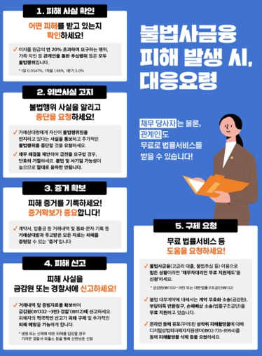 대부업 이용 시 ▲등록대부업체 여부를 확인(네이버 등 포털사이트에서 ‘대부업체 통합조회’ 검색)하고, ▲최고금리(연 20%)를 초과하는 이자는 불법이며, ▲대부계약서(구두·문자·SNS 등 비대면대출 지양)는 반드시 보관해야 하며, ▲약정 이자 외의 수수료·선이자 등은 불법이므로 계약에 응하지 않아야 한다.