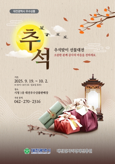 특히 지역 내 유망 중소기업, 사회적기업, 마을기업 등 30개 기업이 참여한다. 대표 상품으로는 ▲홍삼스틱, 흑삼, 흑마늘 진액 같은 건강식품 ▲전통 한과와 김, 기름, 과일 선물 세트 ▲천연샴푸, 비누 등 생활용품이 준비돼 있어, 명절 선물 고민을 덜어줄 전망이다. 전국 택배 서비스도 9월 30일까지 지원돼 대전 외 지역으로도 간편하게 선물 배송이 가능하다.