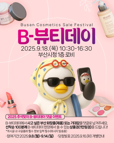 [뉴스스텝] 부산시는 오는 9월 18일 오전 10시 30분부터 오후 4시 30분까지 시청 1층 로비에서 '2025 추석맞이 비(B)-뷰티 데이'를 개최한다고 밝혔다.