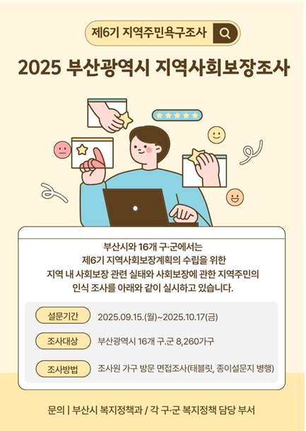 [뉴스스텝] 부산시는 16개 구·군과 함께 오는 9월 15일부터 10월 17일까지 5주간 '2025년 부산광역시 지역사회보장조사'를 실시한다고 밝혔다.