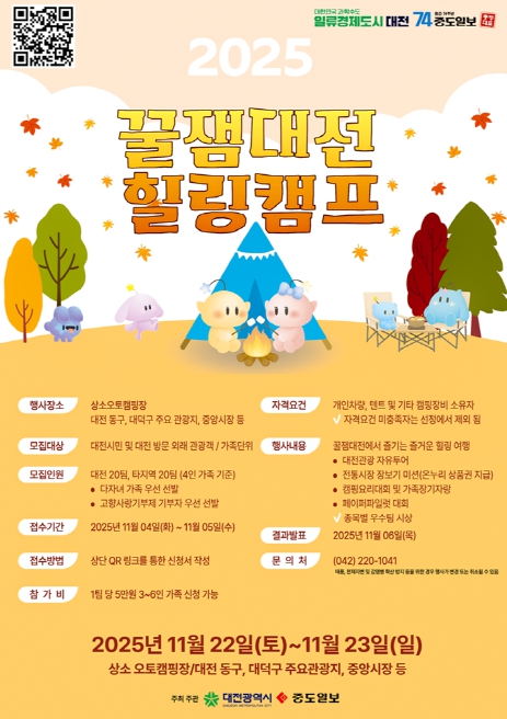이번 힐링캠프에는 대전 시민 20팀과 타 지역 참가자 20팀 등 총 40팀의 가족단위 참가자들이 참여하며, 전통시장 장보기 미션, 캠핑요리대회, 가족장기자랑, 힐링음악회 등 다채로운 프로그램을 통해 지역문화를 체험하고 가을 정취를 만끽할 예정이다.
