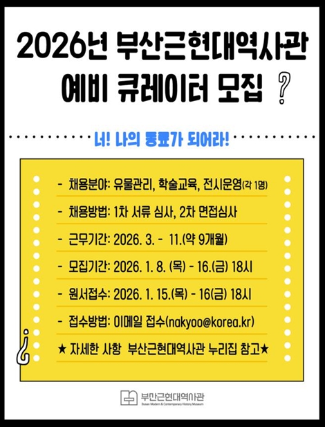 [뉴스스텝] 부산근현대역사관은 박물관 학예 분야 전문인력 양성과 청년 일자리 창출을 위해 오늘(8일)부터 1월 16일까지 '2026년 부산근현대역사관 예비 큐레이터(기간제근로자)'를 공개 모집한다고 밝혔다.