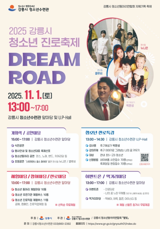 [뉴스스텝] 강릉시 청소년수련관은 오는 11월 1일 오후 1시부터 5시까지 강릉시 청소년수련관 앞마당 및 유피홀에서 청소년들의 진로 탐색과 자율적 참여 확대를 위한 2025 강릉시 청소년 진로축제 'Dream Road'를 개최한다.