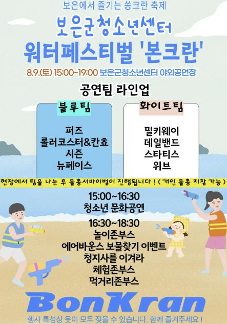 [뉴스스텝] 보은군은 지역 내 청소년들의 알차고 행복한 여름나기를 위해 오는 9일 보은군청소년센터에서 ‘보은군 청소년 어울림마당 워터 페스티벌 본크란’을 진행한다고 밝혔다.