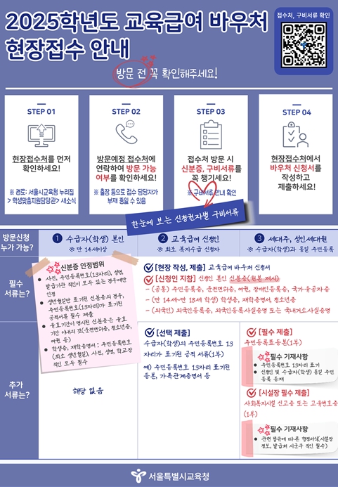 [뉴스스텝] 서울특별시교육청은 2025년 12월 2일부터 12월 12일까지, 2025학년도 교육급여 바우처 미신청자 중 온라인 신청이 어려운 대상을 위해 한시적 현장 접수를 운영한다고 밝혔다.