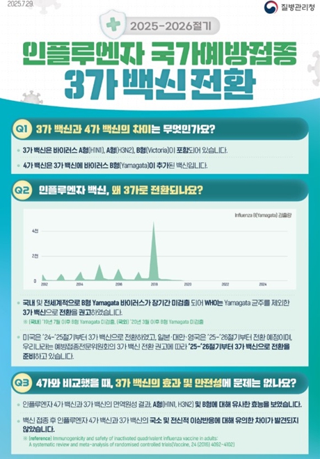 이번 2025-2026 절기 인플루엔자 예방접종부터 세계보건기구(WHO)의 권고사항과 예방접종전문위원회 심의에 따라 기존 4가 백신에서 3가 백신으로 전환해 시행된다.