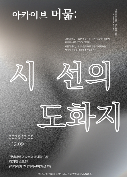 전남대학교 미디어커뮤니케이션학과(학과장 신우열)는 학과 행사 ‘미디어 WEEK’의 일환으로 아카이브 전시 ‘머묾: 시선의 도화지’를 12월 8일부터 9일까지 전남대 용봉캠퍼스 사회과학대학 3층 디지털스크린에서 개최한다.