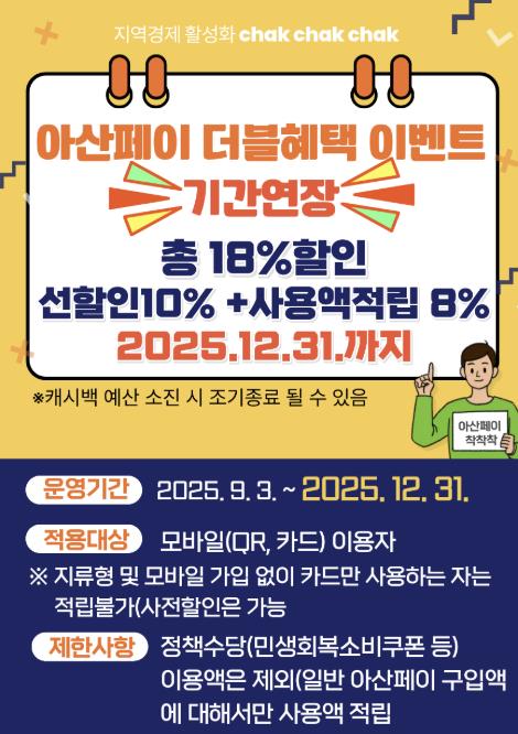 아산시는 행정안전부와의 협의를 통해 당초 11월 말 종료 예정이었던 18% 할인 이벤트를 12월 31일까지 연장해 연말까지 지역 내 소비 촉진과 소상공인 매출 회복을 도모하고 있다.