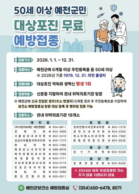 접종 대상은 예천군에 6개월 이상 주소를 둔 50세 이상(1976년생) 군민으로 생일이 지나지 않아도 연중 언제든 접종 가능하다. 또한 예천군 신규 전입자도 전입 6개월 경과 후 주민등록초본을 지참해 보건소에서 대상자 등록을 한 뒤 접종이 가능하다.