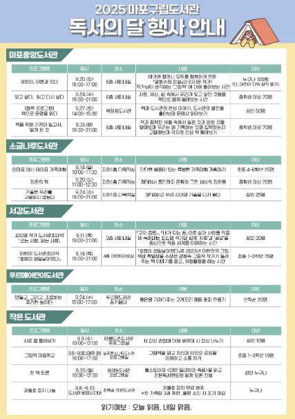 [뉴스스텝] 마포구는 9월 ‘독서의 달’을 맞아 ‘읽기예보: 오늘 읽음, 내일 맑음’이라는 슬로건 아래 주민들이 함께 즐길 수 있는 다양한 독서문화 활동을 진행한다.