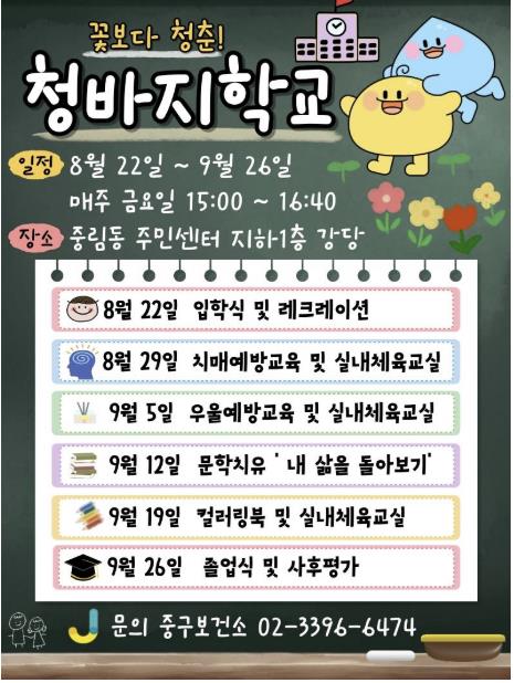 동국대학교, 중구치매안심센터, 중구체력인증센터가 함께 하는 '청바지학교'는 자아존중감 향상 레크리에이션을 시작으로, 치매 예방 인지활동, 우울 예방 교육, 근력 강화 운동, 문학치유 프로그램, 컬러링북 활동 등 다채로운 강의가 마련되어 있다. 특히 각 회차마다 신체활동과 정서 지원이 균형 있게 구성되어 있다.