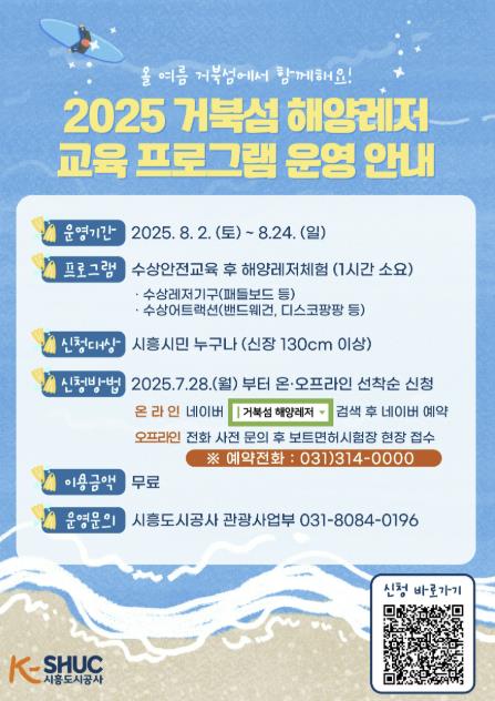 유병욱 사장은 “이번 거북섬 해양레저 교육 프로그램 시범 운영을 통해 시흥시민들이 시화호의 매력을 만끽하고, 해양레저를 안전하게 즐기는 방법을 배우는 유익한 시간이 되기를 바란다”며, “앞으로도 시민들을 위한 다채로운 프로그램을 지속적으로 발굴해 나가겠다”라고 밝혔다.