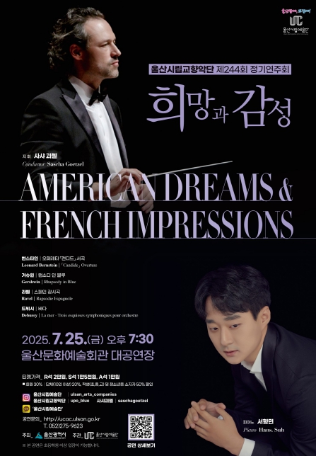 [뉴스스텝] 울산시립교향악단은 오는 7월 25일 오후 7시 30분 울산문화예술회관 대공연장에서 제244회 정기연주회 ‘희망과 감성(American Dreams · French Impressions)’을 무대에 올린다.
