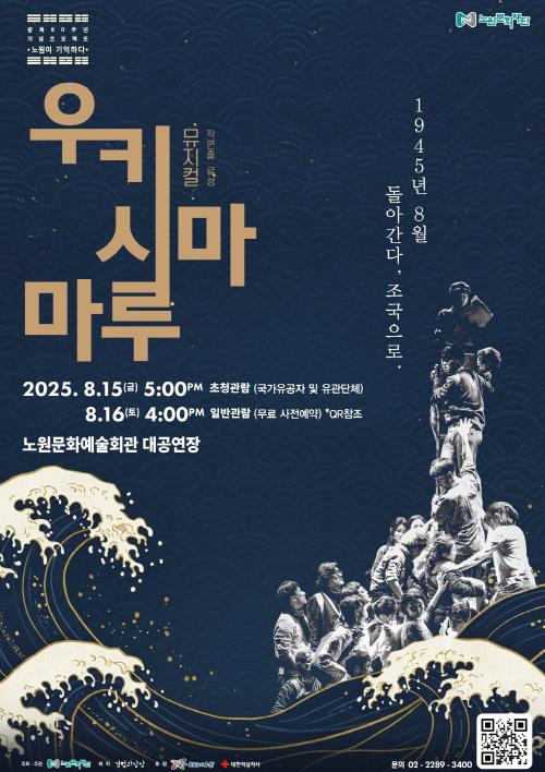 먼저, 뮤지컬 '우키시마마루'는 오는 8월 16일 오후 4시 노원문화예술회관에서 공연된다. 작품은 일본 패전 직후, 강제징용 됐던 조선인들이 귀국하던 중 침몰 사고로 희생된 ‘우키시마마루 사건’을 모티브로 하여, 돌아오지 못한 이들의 아픔과 고향에 대한 염원을 섬세하게 그려낸다. 관람은 무료이며, 예매는 7월 29일 오전 10시부터 노원문화재단 홈페이지에서 가능하다.