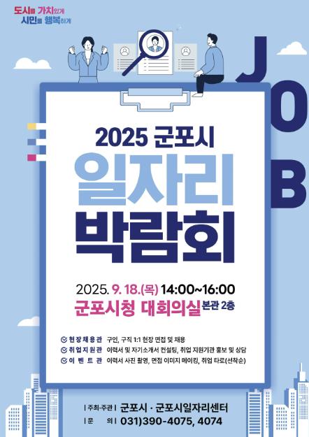 [뉴스스텝] 군포시는 오는 9월 18일 오후 2시부터 시청 대회의실에서 ‘2025년 하반기 일자리 박람회’를 개최함에 따라 8월 11일부터 9월 2일까지 박람회에 참여할 기업체를 모집한다.